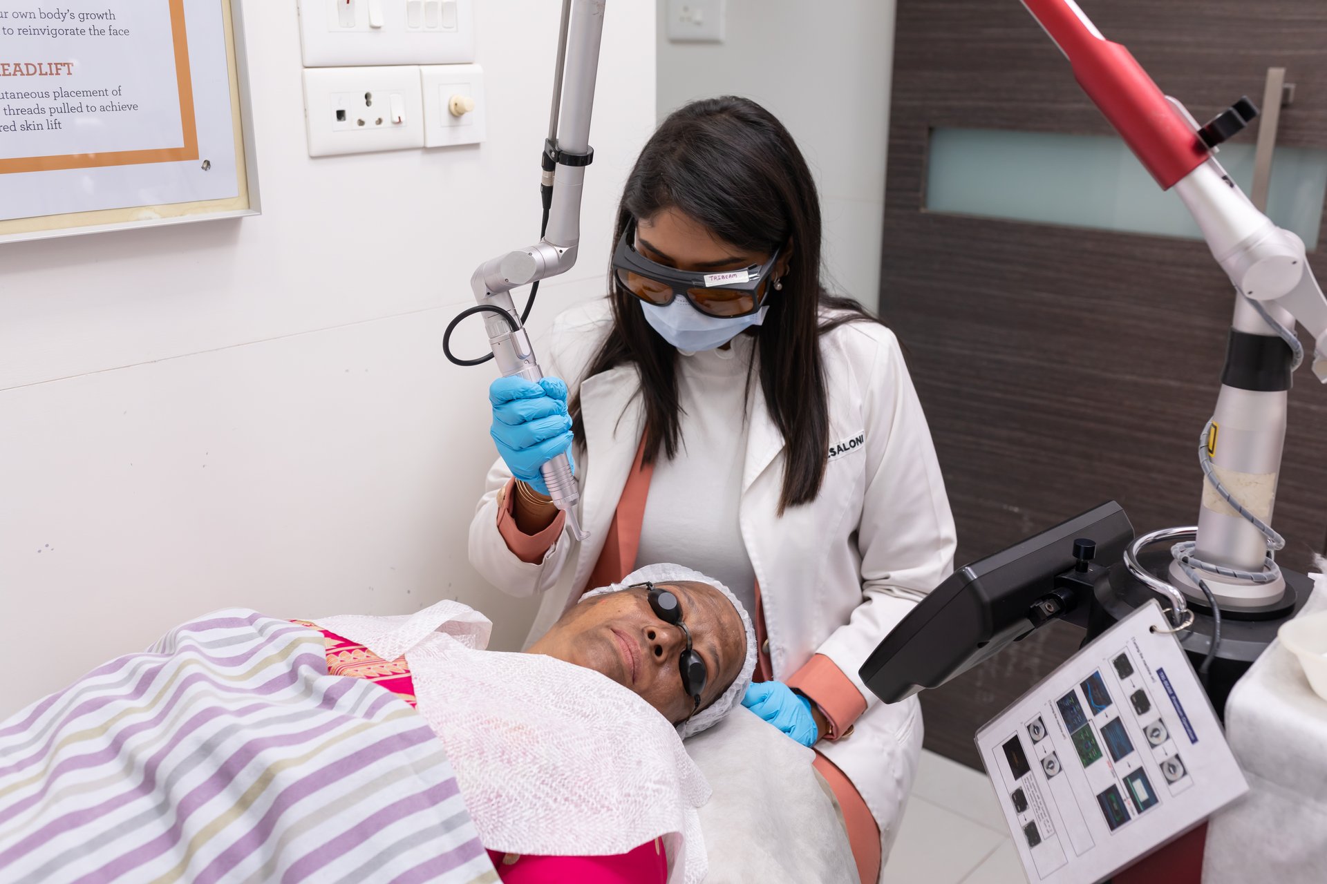 Q-switched Nd:YAG laser is the gold standard for pigmentation in Indian skin. It breaks down melanin deposits in the skin without damaging surrounding tissue. Parameters are set conservatively by a dermatologist — intensity is built progressively to avoid triggering post-inflammatory pigmentation.